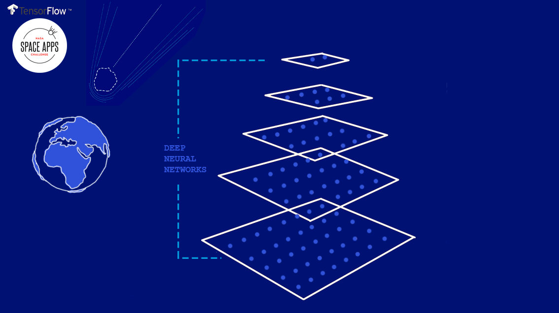 Deep Asteroid es una arquitectura de red Neuronal que clasifica los asteroides en fecha y lugar de impacto. Utiliza varias capas que tienen en cuenta datos sobre su órbita y clase. Como principal framework , usamos TensorFlow , framework open source de Google, utilizado internamente primero dentro de su tecnología del buscador.